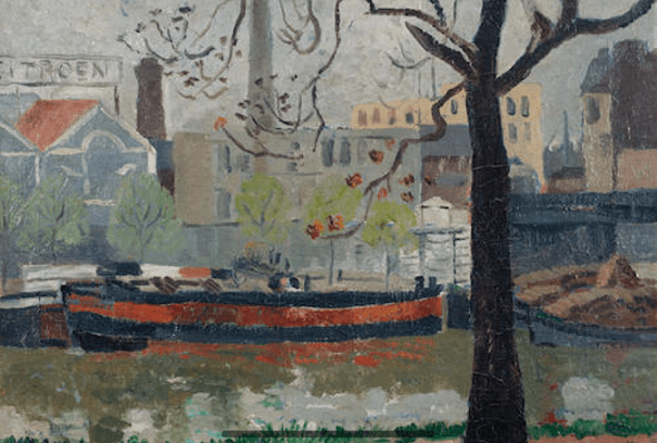 In The Seine Wood shows the Citroen car plant on the Quai de Javel, viewed across the Seine from La Rive Droit. The manufacturing site developed and sprawled until it was ultimately demolished in the 1970s. There is now a 35 acre public park in its place, Parc Andre Citroen. More on the present work