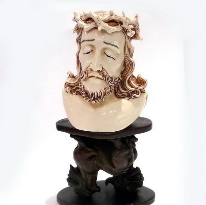 Jesus sitting on a stone block with his head pressed down by a soldier, while the soldier places the crown of his thorn with iron gloves. More on this sculpture