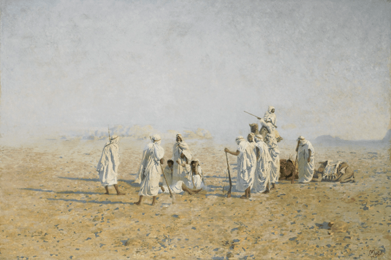 For this work, regarded, from the moment it was presented, to be a masterpiece of Orientalist painting, Belly chose to present an ambitious subject on a canvas of unusually large size. It depicts a long caravan crossing the desert, making its way towards Mecca, Islam’s holiest city and place of pilgrimage for all Muslims.