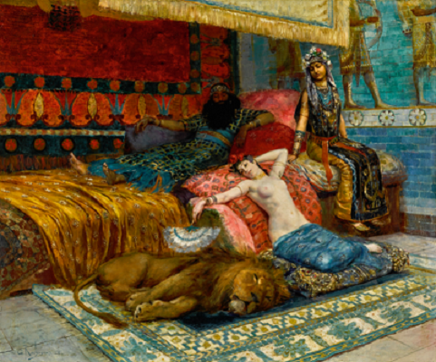 Jacobs was noted for his mastery of nudes, expressed particularly in the representation of such Orientalist themes as “A slave market” or of sleeping and waking boys. His image of Scheherezade from Arabian Nights is noted for its light effects. The famous Ali Pasha was depicted by Jacobs in a moment of relaxed intimacy with his favorite mistress (or wife) Kira Vassiliki (above).
