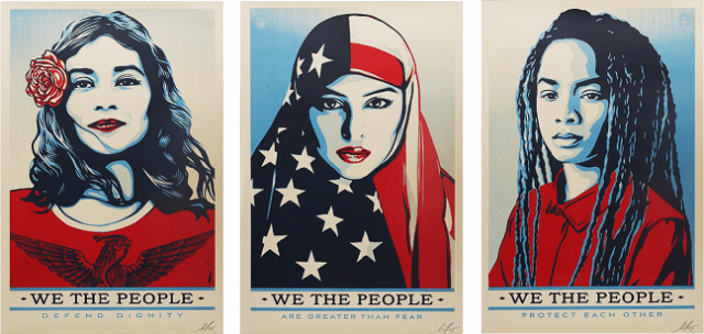 Taking its name from the first line of the US constitution, the series We the People features portraits of Native Americans, African Americans, Muslims, and Latinas depicted in Fairey’s trademark style.