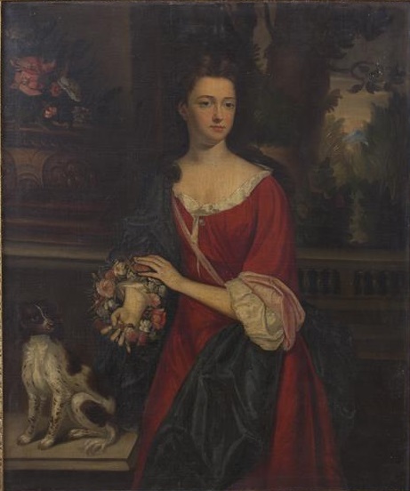 A portrait of Elizabeth Langham, as a young woman, standing three quarter length on a terrace, a spaniel seated beside her, flowers in an ornamental urn at her shoulder, a wooded landscape beyond. It is thought that the landscape element represents the new landscaping at Cottesbrooke. More on Cottesbrooke