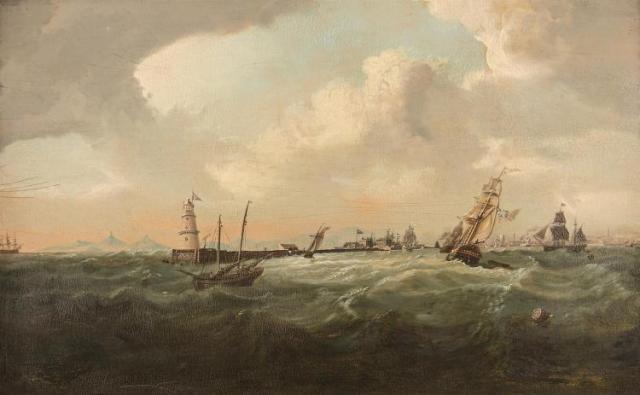 The present work is an atmospheric panorama ranging from the north of Dublin city on the right with it’s church spires over to south county Dublin on the extreme left, with views of Killiney and Dalkey and the Sugarloaf Mountain beyond. The main concentration however is on the myriad of ships that are heading into or exiting Dublin port. Sadler conveys the busyness of the channel leading into the city and the River Liffey, with an anchored coastal trader in the foreground and nearby a British naval frigate heading into port. Numerous other large sailing ships are evident further into the port area.