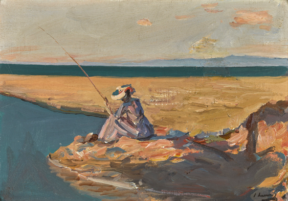 The Angler is likely to have been painted on the long strand to the east of the Medina at Tangier. Here, during winter rains, a stream known locally as the ‘Jews’ River’, ran off into the sea. It is unlikely to have been suitable for fishing, yet it and the neighbouring rocks were an endless source of fascination for the children in the Lavery entourage. More on this painting