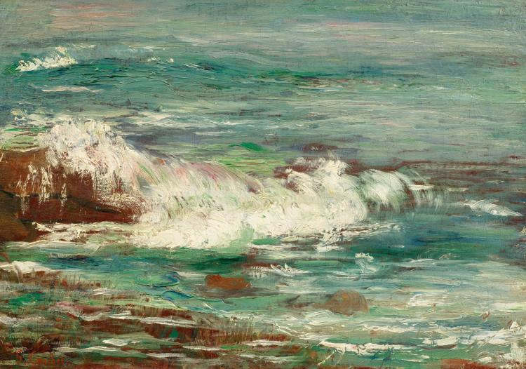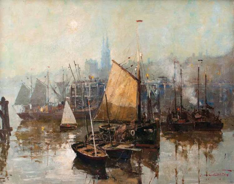 For Joe Duncan Gleason, (1881 – 1959 Glendale, CA) it was boating – and life on the sea, in general – that steered the motley professions and avocations of the California painter Joe Duncan Gleason. Trained at the Chicago Art Institute and the New York Arts Students’ League, he illustrated for various magazines, including Leslie’s Monthly, Ladies Home Journal, and Forecast, from 1903 to 1914; during this period, while competing as a gymnast in national competitions, he acquired a 36-foot yawl and sailed often on Long Island Sound. Gleason’s earliest paintings are Impressionist in style and depict the scenic hills of his childhood Los Angeles as well as the peopled shores of nearby Laguna Beach. A brief return to New York from 1919 to 1924 inspired Gleason to take up marine painting, model shipbuilding, and writing about sailing: he published Windjammers, a book of etchings (1922), followed later by Islands of California (1950). In the mid-1920s, Gleason established his studio in the harbor town of San Pedro, California, and began consulting for Metro-Goldwyn-Mayer and Warner Bros., providing visual guides for the ships that appeared in such films as Yankee Clipper, Captain Blood, and The Charge of the Light Brigade. When not painting or lecturing on historical ships, he was sailing, both with the U.S. Coast Guard Auxiliary during WW II and recreationally with the California Yacht Club.More on Joe Duncan Gleason