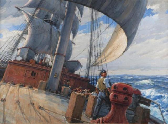 Clipper Bohemia; built on speculation by Houghton Brothers at Bath; ME in 1875. This vessel was used primarily in the California trade; making 12 Westward passages averaging 132 days and 11 Eastward passages averaging 119 days. In 1894-95 she made one voyage in the Philipine Trade. In 1897 she joined the Alaska Packers fleet and was home ported in San Francisco. Bohemia remained in the Alaskan Cannery service until 1925 when she was sold to the shipbreakers. However; she was saved from the breakers and purchased by the Los Angeles Motion Pictures Concerns company and became part of the ‘Movie Fleet’. In 1926 Duncan Gleason was hired as a consultant to Cecil B. DeMille to work on the silent film ‘Yankee Clipper’. Gleason sailed aboard Bohemia which was used for on deck scenes in the movie. A bow sketch study Gleaon made in 1926 became the foundation for this work which was painted nearly 25 years later. Bohemia was deliberately blown up and sunk during the making of a movie about submarine warfare in the early 1930’s. More on Downeaster Bohemia