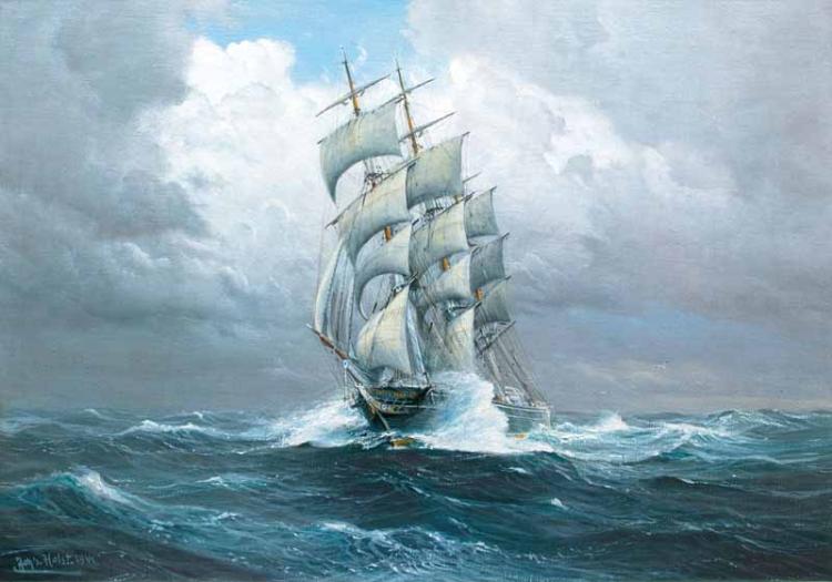 Holst was a very active artist and was tasked by many shipowners to paint portraits of their ships because of his high quality works. Portraits of sailing ships, for the shipping company F. Laeisz in Hamburg et al., form the main part of his complete works that consists of about 1000 paintings. The paintings of Holst are especially valued in northern Germany. More on Johannes Holst