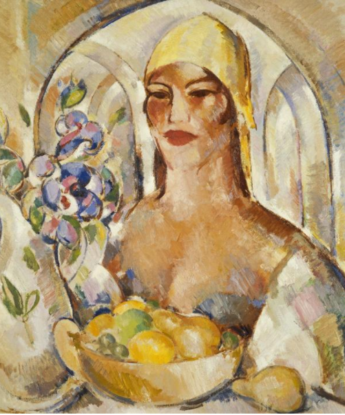 This is a portrait of the artist’s wife Margaret Morris (1891-1980), an influential innovator in modern dance and an accomplished artist in her own right. She studied dance in Paris and by 1910 was established in London with her own dance school, becoming London’s youngest theatre manager two years later. Morris met Fergusson in Paris in 1913 and they moved to Glasgow in 1939. Together they collaborated on many dance projects and Morris helped to lay the foundations for modern dance practice. Fergusson’s paintings often have erotic overtones – here the shapes of the fruit echo the forms of the breasts. He has used a reduced palette of colours and created harmony within the composition through the repeated use of arcs, on the head, still-life elements and arches in the background..More on this painting