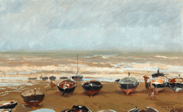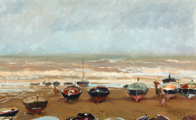 Beneath a leaden sky, fishing boats lie grounded on the sand. Either it is the end of the day and the fisherman are preparing to go home, or the day’s fishing has been called off due to the rough sea. One of a series of increasingly spontaneous scenes of the beach at Valencia, the freedom of execution and liveliness of spirit that the work exhibits are qualities that go to the heart of Sorolla’s aesthetic and account for the artist’s enduring popularity. More on this painting