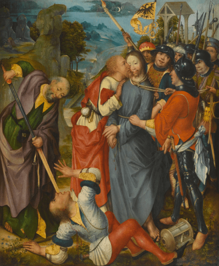 The kiss of Judas, also known as the Betrayal of Christ, is how Judas identified Jesus to the multitude with swords and clubs who had come from the chief priests and elders of the people to arrest him, according to the Synoptic Gospels. The kiss is given by Judas in the Garden of Gethsemane after the Last Supper and leads directly to the arrest of Jesus by the police force of the Sanhedrin.