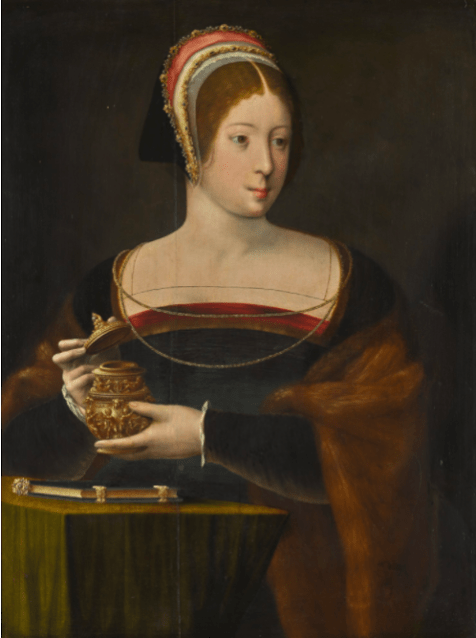 Here the figure lifts the lid of an unguent jar that identifies her as Mary Magdalene, the most prominent of Christ’s female followers. Her magnificent, richly ornamented clothing and headdress are typical of sixteenth-century courtly dress. The pristine condition of the paint surface preserves each of the finest details, every strand of hair and thread of gold, of this mysterious Mary Magdalene. More on this painting