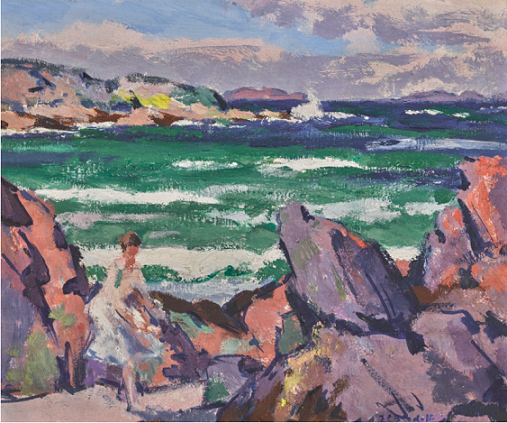 It was unusual for Cadell to include figures in his Iona paintings, but here he has placed a woman clad in a white dress which flutters in the sea-breeze and gives a beautifully animated element echoing the rolling waves in the bay beyond. Mauve, sea-greens and brilliant blues give a vibrancy to the picture and are wholly Colourist in their harmonies and contrasts. North Wind, Iona depicts the North shore, painted amongst the rocks that form the west boundary of the sands at Chalbha, where we catch a glimpse of the uninhabited island of Lunga, partly hidden by the rocky islet of Eilean Chalbha. More on this painting