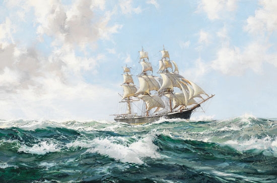 Montague Dawson RMSA, FRSA (1890–1973) was a British painter who was renowned as a maritime artist. His most famous paintings depict sailing ships, usually clippers or warships of the 18th and 19th centuries. Montague was the son of a keen yachtsman and the grandson of the marine painter Henry Dawson (1811–1878), born in Chiswick, London. Much of his childhood was spent on Southampton Water where he was able to indulge his interest in the study of ships. For a brief period around 1910 Dawson worked for a commercial art studio in Bedford Row, London, but with the outbreak of the First World War he joined the Royal Navy. Whilst serving with the Navy in Falmouth he met Charles Napier Hemy (1841–1917), who considerably influenced his work. In 1924 Dawson was the official artist for an Expedition to the South Seas by the steam yacht St.George. During the expedition he provided illustrated reports to the Graphic magazine.