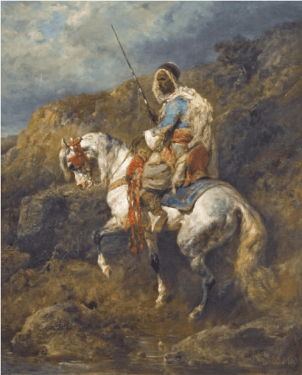 Adolf Schreyer (July 9, 1828 Frankfurt-am-Main – July 29, 1899 Kronberg im Taunus) was a German painter, associated with the Düsseldorf school of painting. He studied art, first at the Städel Institute in his native town, and then at Stuttgart and Munich. He painted many of his favourite subjects in his travels in the East. He first accompanied Maximilian Karl, 6th Prince of Thurn and Taxis through Hungary, Wallachia, Russia and Turkey; then, in 1854, he followed the Austrian army across the Wallachian frontier. In 1856 he went to Egypt and Syria, and in 1861 to Algiers. In 1862 he settled in Paris, but returned to Germany in 1870; and settled at Cronberg near Frankfurt, where he died.