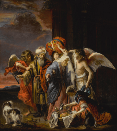 The story of Lot, nephew of Abraham, and his flight from the city of Sodom is told in Genesis (19: 1-28). Two angels, to whom Lot had given hospitality for the night, warned him that God was about to destroy the cities of Sodom and Gomorrah for their sinfulness, and urged him to flee with his wife and two daughters. The angels warned them not to look behind them as they left “lest they be consumed.” Lot’s wife did not heed their advice and, upon looking back, was turned into a pillar of salt. This painting depicts the moment before this happens, as the angels are seen literally pushing the family along as one daughter frantically gathers food and valuables in a basket, while the other has bundled other belongings in a rug which she carries on her head. Lot’s wife weeps and pulls away from him as he tries to persuade her to come with them. Maes touchingly captures the anguish and confusion of the moment. More on this painting