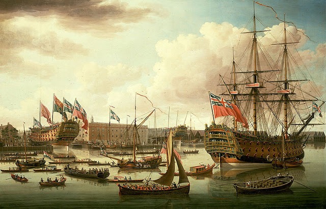 A fictitious combination of two events set in Deptford Dockyard in southeast London, England, UK: the launch of the H.M.S. Cambridge (left) in Deptford on 21 October 1755, and the H.M.S. Royal George (right) which was actually launched at Woolwich Dockyard the following year, 1757. More on this painting