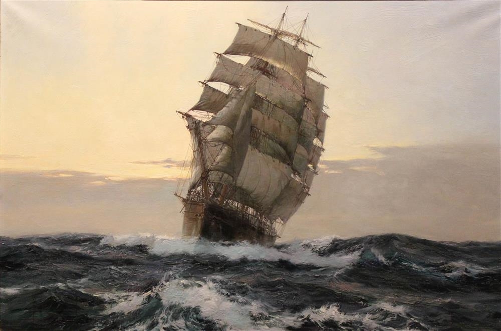 Montague Dawson RMSA, FRSA (1890–1973) was a British painter who was renowned as a maritime artist. His most famous paintings depict sailing ships, usually clippers or warships of the 18th and 19th centuries. Montague was the son of a keen yachtsman and the grandson of the marine painter Henry Dawson (1811–1878), born in Chiswick, London. Much of his childhood was spent on Southampton Water where he was able to indulge his interest in the study of ships. For a brief period around 1910 Dawson worked for a commercial art studio in Bedford Row, London, but with the outbreak of the First World War he joined the Royal Navy. Whilst serving with the Navy in Falmouth he met Charles Napier Hemy (1841–1917), who considerably influenced his work. In 1924 Dawson was the official artist for an Expedition to the South Seas by the steam yacht St.George. During the expedition he provided illustrated reports to the Graphic magazine.