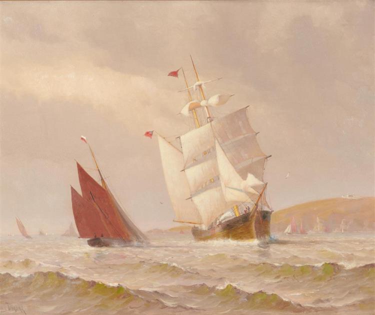 In 1868, Johnson was a sailor aboard the Sunbeam, bound for South America. The ship burned at sea in 1871 and the artist was one of 12 survivors who was rescued off the coast of South America. He soon returned to Boston, where he studied at the Lowell Institute and with noted marine painter William E. Norton. From 1887-1890, he studied in Holland, France and England. When he returned to America, he opened a professional studio on Boston’s India Wharf.