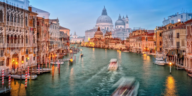 The Grand Canal in Venice, Italy forms one of the major water-traffic corridors in the city. Public transport is provided by water buses and private water taxis, and many tourists explore the canal by gondola.