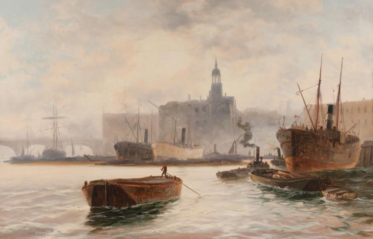 Fletcher worked largely in the City, painting scenes of the Thames and recording the busy shipping lanes of this important industrial waterway. During hard times his work was handled by an Islington dealer who sold many of his paintings to American dealers, with whom it proved very popular. He also painted South coast scenes, some including H.M.S. Victory. The occasional portrait came from his hand, including one of the mayor of Margate, which still hangs in the Town Hall, and for which he was reputedly never paid the 80 guinea fee.