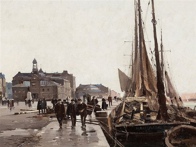 The painting shows a part of the Seine dockside with fishermen, merchants, ships and the cityscape in the background