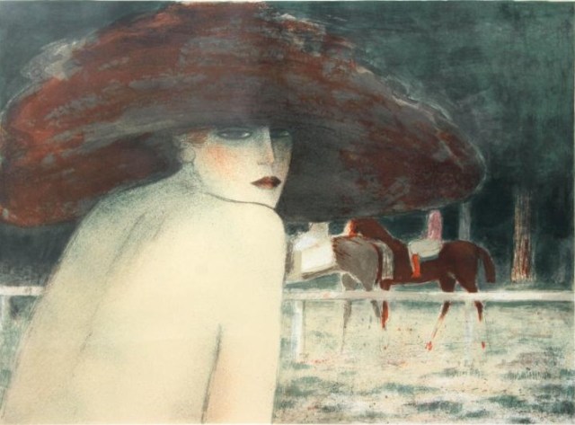Jean-Pierre Cassigneul is a French artist who continues the decorative traditions of the early 20th century artists Bonnard and Vuillard. He paints fairly flatly rendered colorful women with stylized classical, dramatic features with large, stylized eyes, who often wear large hats and are dressed elegantly. Cassigneyl studied in Paris at the Ecole des Beaux Arts from which he graduated in 1958. His works have been exhibited widely throughout Europe, Japan and the United States. In addition to painting, he is known for making large-scale lithographs and etchings as well as designs for tapestries. Cassigneul has some thirty tapestries woven after his designs. He has also illustrated publications (eg.) Joseph Kessel, La Tour de Malheur. More on Jean-Pierre Cassigneul