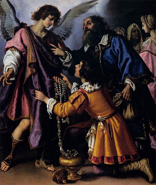 The subject comes from the Book of Tobit , one of the Apocryphal books in the Old Testament, and shows the final scene in the story of how Tobit, a blind old man, was healed by the gall of a fish. This fish had been caught by his son Tobias on the orders of the Archangel Raphael. But Raphael presented himself to Tobit’s family as a simple traveller, and the old man wished to thank him in the fullness of his joy at the return of his sight. The angel refused all the offered treasures and revealed his identity. More on this painting