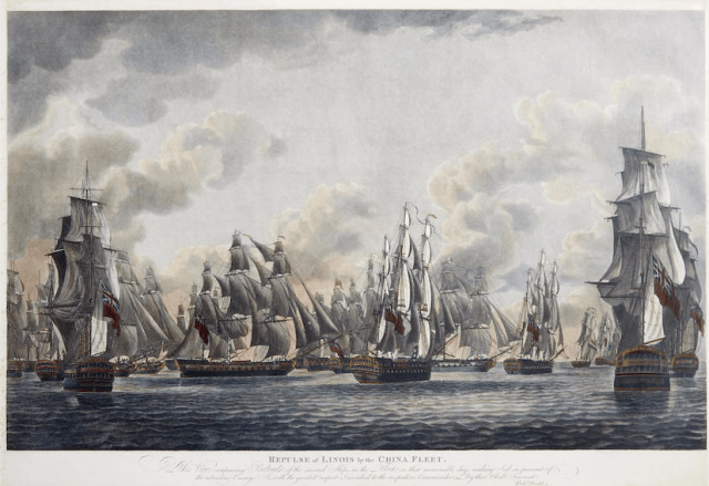The fleet of the East India Company homeward bound from China engaging and repulsing a French squadron near the Straits of Malacca, on 15 February 1804.