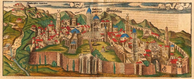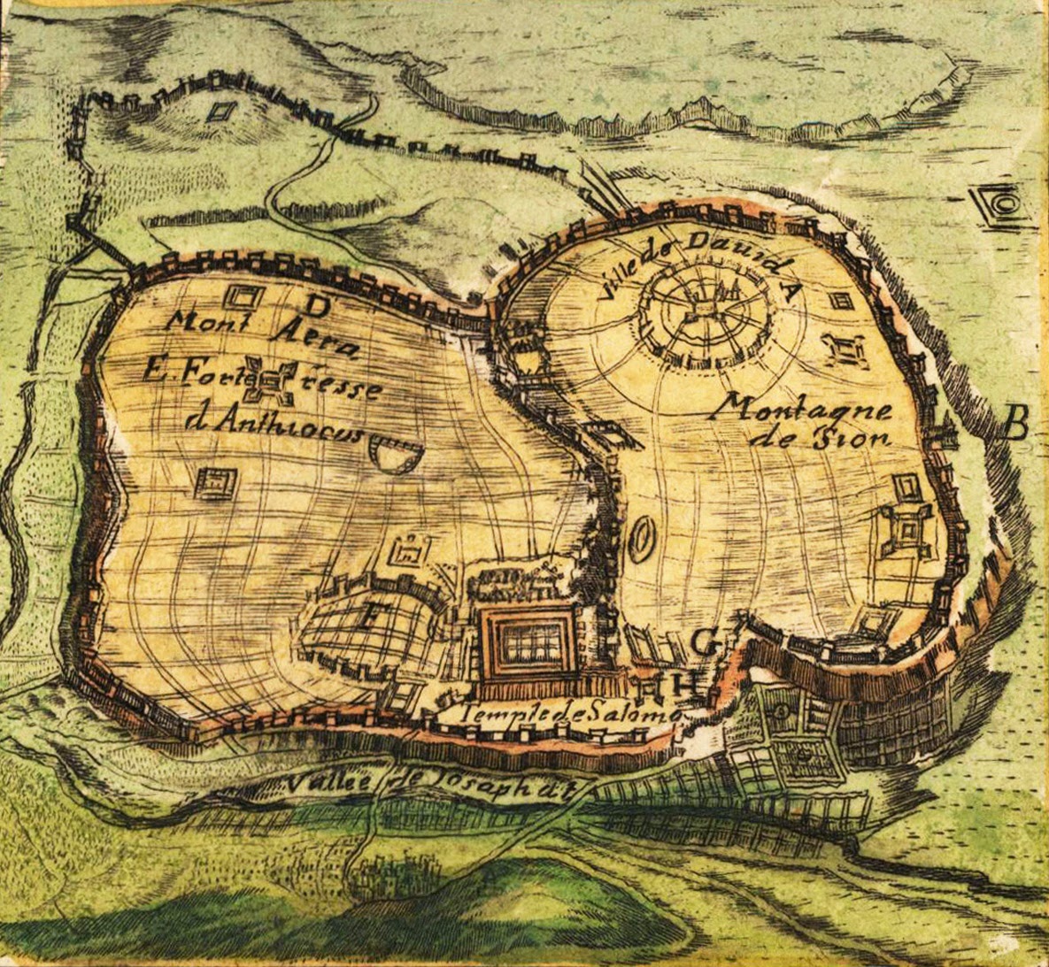 Copper engraving, hand colored in outline and wash. A beautiful bird’s eye view of Old Jerusalem – Date: 1719