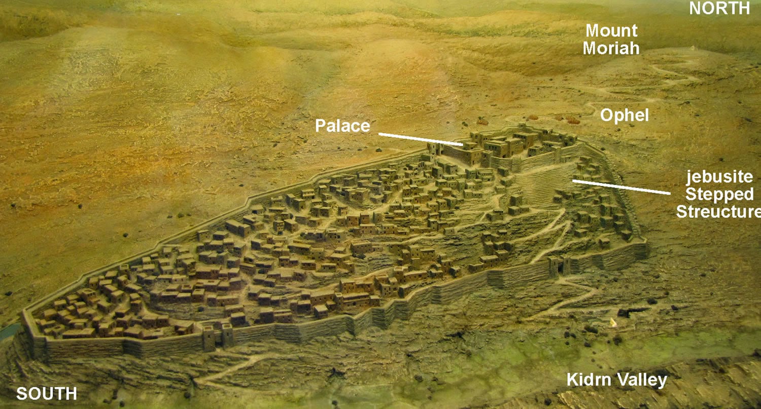Details labeled on a model of the ancient city of Salem (Jerusalem) or the city David took from the Jebusites to establish as the center of his kingdom.