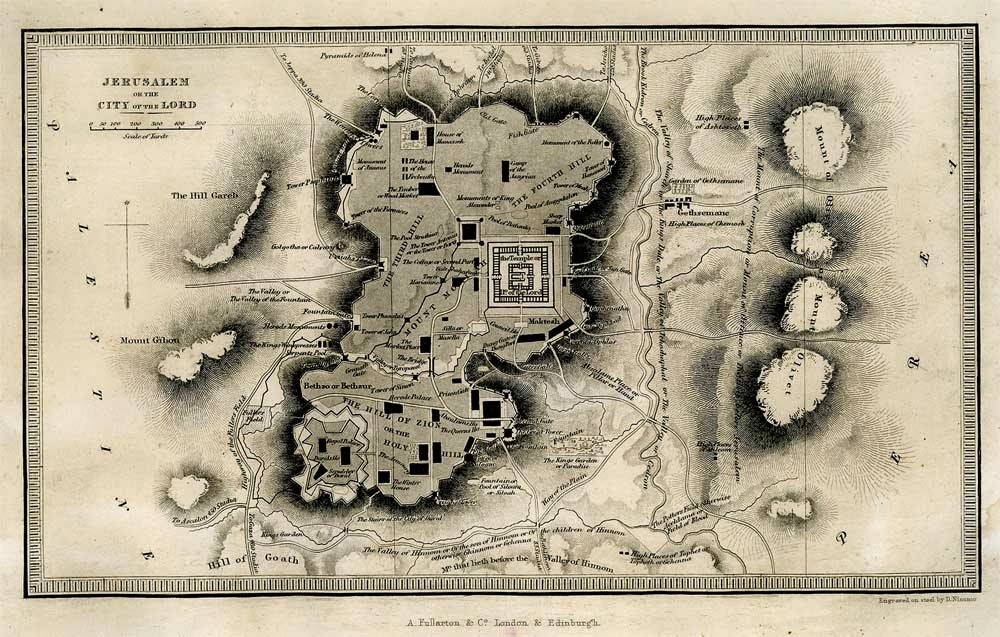 Jerusalem or the city of the Lord. This map was engraved by D.Nimmo and published by A . Fullarton & Co. The map was first published in 1835 by Samuel Arrosmith who was a bookseller in London. This publication is from 1840’s. The city of Jerusalem is depicted as it would have looked at the time of Jesus. Prominently shown are the Temple mound, the hill of Zion and mount of Olives. Many other locations are depicted.The map is an original engraving on steel. More