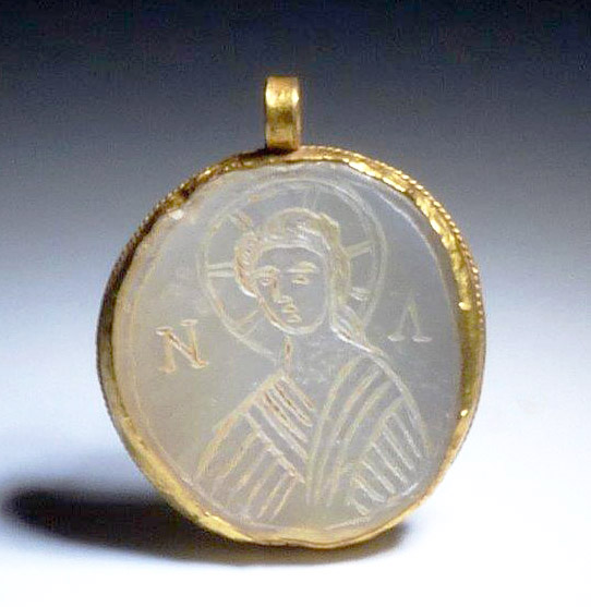 Byzantine Empire, ca. 7th century CE. This is a 14k+ gold pendant inlaid with an inscribed shell intaglio featuring a religious figure and writing. Size: 0.9″ W x 1.2″ H (2.3 cm x 3 cm), weighing 4 grams.