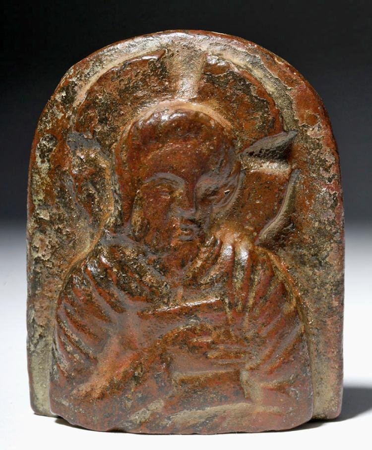 Eastern Roman Empire, Byzantium, ca. 10th to 12th century CE. A near-miniature, tombstone-shaped, solid-cast iron icon with a bas-relief image of Jesus Christ as Pantocrator holding the Gospel book on one side and a cross on the verso. This depiction of Pantocrator Christ is somewhat unusual as the Gospel is closed and Christ is not making the blessing gesture. Notice the remarkable technique of this piece, in particular the elegant delineations of Christ’s wavy hair and the folds of his cascading robe. The most accepted translation of Pantocrator is “Almighty” or “All Powerful” and the visage of Jesus certainly projects his ominpotence. This iconic depiction continues to be a central icon of the Eastern Orthodox Church. A beautiful and technically impressive personal devotional object, a wonderful and rare example. Size: 1.75″ W x 2.125″ H (4.4 cm x 5.4 cm)