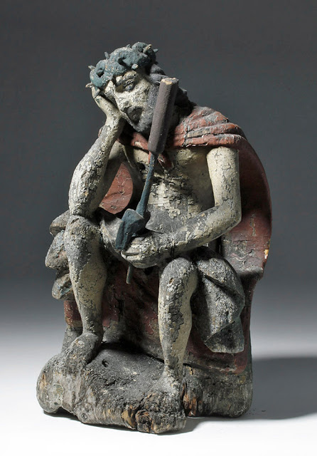 Mexico, 18th century CE. An expressive and beautiful wooden carving of Christ, seated , wearing a red cape and a crown of thorns. Small patches of color – the cape, the green of the crown, and small blue dots on the eyes – draw the viewers’ attention. The rest is black and cream painted. A sensitive religious folk art carving. Size: 7.25″ W x 12.6″ H (18.4 cm x 32 cm)
