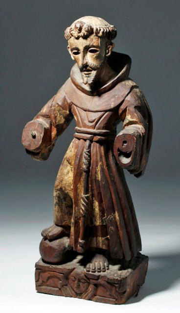 Mexico, 19th or early 20th century CE. A large, sensitive statue of a saint, probably St Francis of Assisi, carved in wood with a dynamic stance – one foot standing atop a ball, arms out, with his head tilted to one side. He has a classically Franciscan haircut and beard, wide, staring eyes that probably once had inlays, and a wonderfully sculpted flowing belted robe, complete with dangling rope. A pattern of gilding and black marks the robe, very clearly seen on the back. Interestingly, the figure stands atop a carved dais (all part of the same piece of wood) that has a face carved in its front side. Size: 10.55″ W x 24.5″ H (26.8 cm x 62.2 cm)