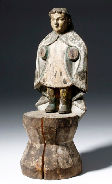 Mexico, Spanish Colonial period, 18th century CE. A carved wooden santo or friar, short and a little portly, wearing a well-painted cloak and with a smiling expression on his face. Perhaps once a decorative element in a home or small church. Size: 4.75″ W x 12.2″ H (12.1 cm x 31 cm)