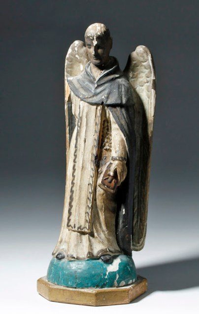 Mexico, Spanish Colonial period, late 18th to early 19th century CE. A tall, elegant carved wooden statue of the angel Gabriel, shown here with long, narrow wings and holding a Bible with a cross on its cover. His clothing is highly detailed and his face has a serene expression. Size: 5.4″ W x 13.35″ H (13.7 cm x 33.9 cm)