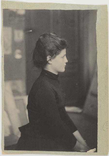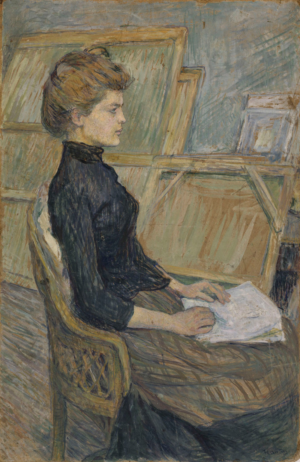 During the stay of Toulouse-Lautrec in the workshop of the rue Caulaincourt he was enthusiastic about the beauty of a young neighbor named Hélène Vary, using a photograph as a model to paint two portraits. One of them appears only of the bust (below) and in the other shows almost the whole body, seated in a chair with papers in her lap (above). The model is sitting in front of large canvases that indicate the location as his workshop, serving to create the spatial effect through a network of lines. But most significant is the face of the girl, in profile, strictly copying the photograph, showing the beauty of a young bourgeois.