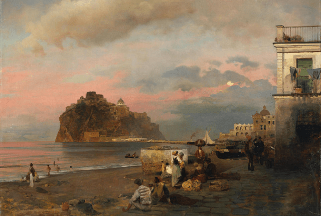 Oswald Achenbach (2 February 1827 – 1 February 1905) was a German painter associated with the Düsseldorf school of painting. Though little known today, during his lifetime he was counted among the most important landscape painters of Europe. Through his teaching activities, he influenced the Kunstakademie Düsseldorf. His brother, Andreas Achenbach, who was twelve years older, was also among the most important German landscape painters of the 19th century. More on Oswald Achenbach