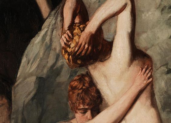 Trübner painted five versions of the theme of Prometheus. The 1889 version follows the “Prometheus Bound” by Aeschylus, where he appears attached to the rock, punished for having given fire to men. More
