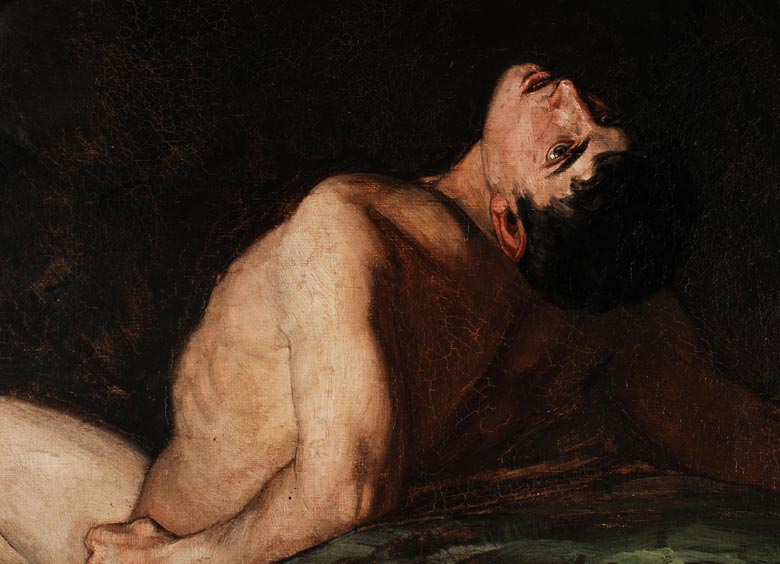 Trübner painted five versions of the theme of Prometheus. The 1889 version follows the “Prometheus Bound” by Aeschylus, where he appears attached to the rock, punished for having given fire to men. More