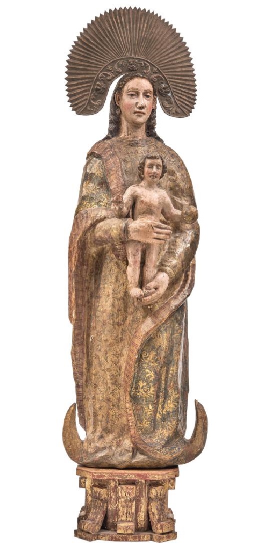 The depiction of the Madonna on the crescent is based on the vision of John the Evangelist in chapter 12 of Revelation, the final book of the New Testament (here, the King James version):