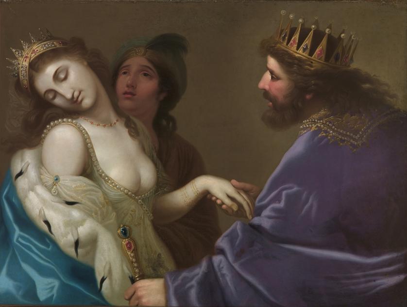 This painting recounts the story of the Jewish heroine Esther, who appeared before King Ahasuerus to plead for her people. She, thus, broke court etiquette and risked death. She fainted in the king’s presence, but her request found favor