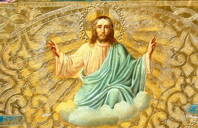 This icon presents an ensemble of blessed saints – including Ann, Elizabeth, Paraskeva, Eudokia, Gregory of Nazianzus or Gregory of Nyssa, Josef, and Mary of Egypt standing in two rows, each saint identified with a gold on blue banner, all beneath Jesus as he descends from the heavens on billowing clouds donning pastel pink and blue robes.