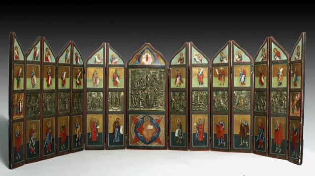 A portable iconostasis comprised of 15 folding hinged panels including a central double panel with 14 side panels presenting 4 finely painted registers, each icon identified in handwritten Cyrillic. The uppermost register depicts half-length portrayals of patriarchs and prophets surrounding God the Father, and the Son, on the central lunette. Full-length saints engaged in intercessionary prayer Central register of painted icons commemorating feast days. In the lowest register, a central panel depicting Christ the Savior Enthroned holding the gospel on his knees surrounded by a blue mandorla with faint monochromatic. Images of angels and a red rhombus with signs of the 4 evangelists occupying the corners, surrounded by smaller full-length panels depicting the Virgin, various archangels, and saints.
