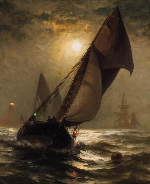 Edward Moran (August 19, 1829 in Bolton, Lancashire, England – June 8, 1901 in New York City) was an American artist of maritime paintings. Moran was born in England on August 19, 1829. Following in the footsteps of his father’s profession, he learned to operate a hand-loom at a young age, though he would often be found sketching with charcoal on the white fabric instead of plying the shuttle. His family first emigrated to Maryland in 1844, and then to Philadelphia a year later.