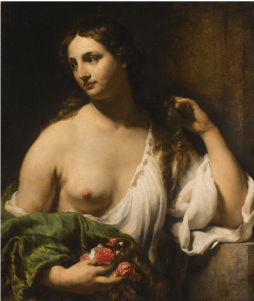 William Drost’s Flora was painted during the artist’s brief stay in Venice during the 1650s and has hitherto remained unknown to scholars. The work should be considered one of Drost’s very best paintings, comparable to his undisputed masterpiece, the Bathsheba in the Louvre. It is a remarkable synthesis of the artist’s early training in Amsterdam under Rembrandt and the more mature style he developed in Venice, when he came under the direct spell of Titian, to whom this work is a clear homage. Titian’s own Flora is known to have been in Amsterdam in the collection of Alfonso López, a Spaniard in the service of Cardinal Richelieu, but Drost probably did not see it in person. Rembrandt almost certainly did, and Drost would very likely have been aware of the design through drawings and prints of it. It is only once Drost arrived in Venice that he finally would have had direct access to a multitude of works by the Venetian master. Drost’s interpretation of the subject thus successfully combines elements from the most important school of painting from the Dutch 17th century with the legacy of Venice’s greatest artist. More on this painting