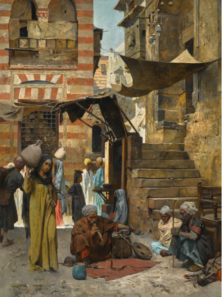 In his paintings, the daily life in Cairo, where he frequented, played the most important role. His paintings have titles such as “The Snake Charmer” or “The Storyteller”. In 1892 he undertook an Egyptian journey with the same-age sculptor Arthur Strasser.