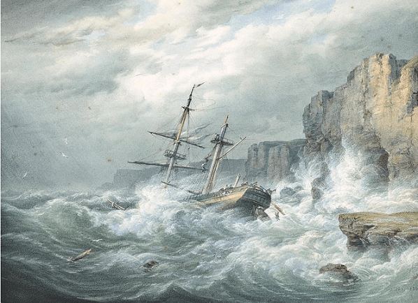 A stiff onshore breeze with a dismasted merchantman foundering on the rocks, c. 1856.’
