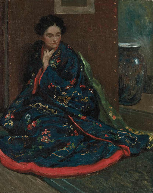 The passion for Japanisme that swept through American art in the 1890s is exemplified in Seated Woman in Kimono. Taking an approach inspired by Whistlerian aestheticism, Chadwick offset the broad sweep of his subject’s flowered garment against the compact geometry of her space, creating as much a decorative conception as a rendering of his subject. Chadwick’s Impressionist brush handling serves to suppress individual detail, adding to the overall harmony of the image. More on this painting